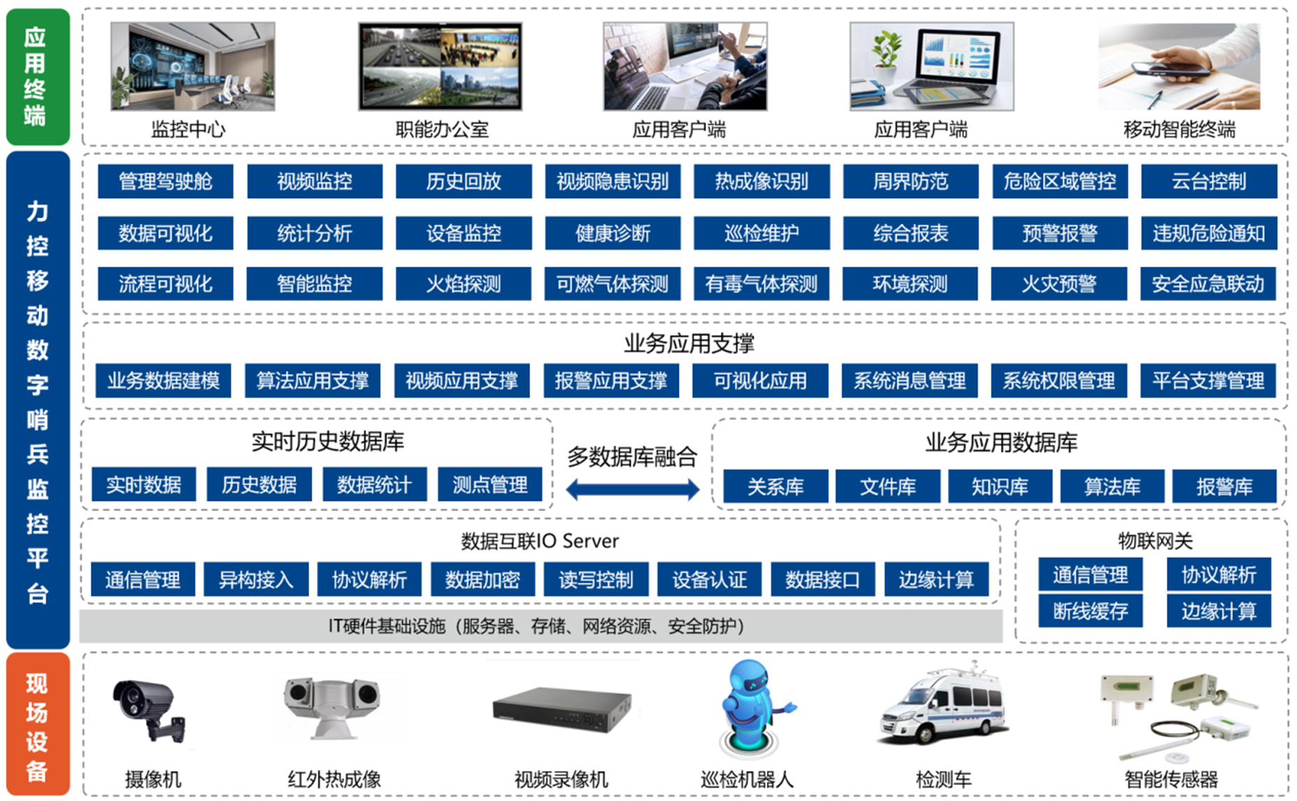 力控移動(dòng)數(shù)字哨兵監(jiān)控平臺(tái)支持探測裝置、智能傳感器、視頻圖像、安防報(bào)警以及各類工業(yè)設(shè)備統(tǒng)一接入管理,實(shí)現(xiàn)各維度數(shù)據(jù)統(tǒng)一展示分析,并結(jié)合算法模型實(shí)現(xiàn)AI識(shí)別、危險(xiǎn)提醒、數(shù)據(jù)分析、預(yù)警等智能應(yīng)用, 提高現(xiàn)場安全防范、智能運(yùn)維能力,該平臺(tái)目前已廣泛應(yīng)用于石油、化工、礦山、樓宇、變配電、交通、環(huán)保等領(lǐng)域。