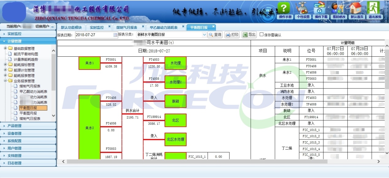 系統匯總自動采集的能源計量數據和手工補充錄入的能源計量數據,針對單個耗能裝置或耗能考核單元,基于能源平衡模型按同類能源介質進行能源供給、消耗、損耗的平衡計算,生成能源統計系列報表。統計項包括:各種能源介質的采購量、自產量、消耗量、銷售量、損失量等信息。