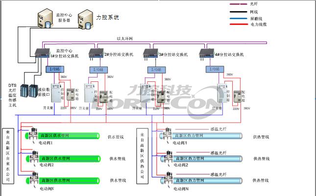 ● 管線閥門控制,通過測溫光纖,發現熱力管線泄漏,監控中心控制系統可根據預設方案,自動或人工發送控制信號給管溝現場控制器,實現熱力調節閥門的遠程控制,閥門開關狀態實時顯示。