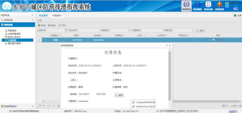 汛情發(fā)生后,通過已被調(diào)度的各個模塊來對事故進(jìn)行處理,合理安排泵站的抽排水、搶險車輛和搶險隊(duì)伍等對人員物資的搶救,按照應(yīng)急預(yù)案有條不紊的應(yīng)對各種突發(fā)事故。對已經(jīng)完成的搶險救災(zāi)任務(wù)形成簡報,地圖展示位置信息,可查看處理結(jié)果,對搶險救災(zāi)任務(wù)進(jìn)行總結(jié),用最優(yōu)的措施保障人民生命財(cái)產(chǎn)安全。