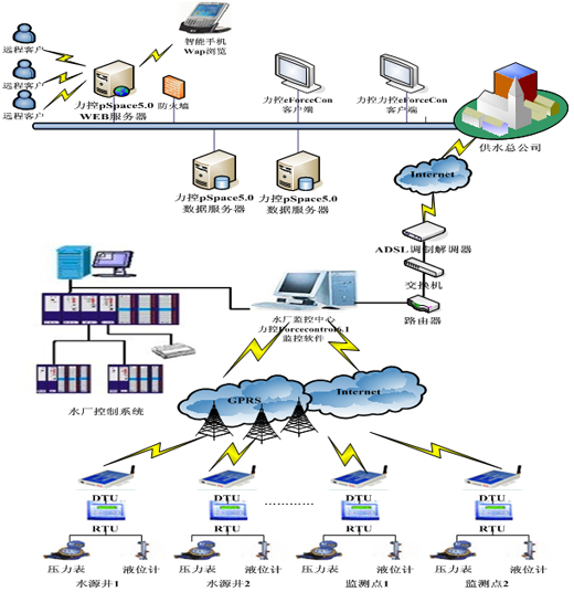 (2)遠程站點利用新的通訊方式GSM或GPRS,將供水管網的相關數據實時的傳輸到供水公司的一級監控中心。