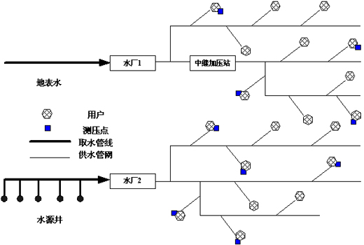(4)應具有優化調度功能。根據管網監測系統反饋的運行狀態數據,運用數學上的最優化技術,確定各個水廠的最佳供水量。進而確定供水泵站內最優工作水泵臺數和組合,完成供水泵站的效率優化,從而解決供水不均,耗電大等問題。