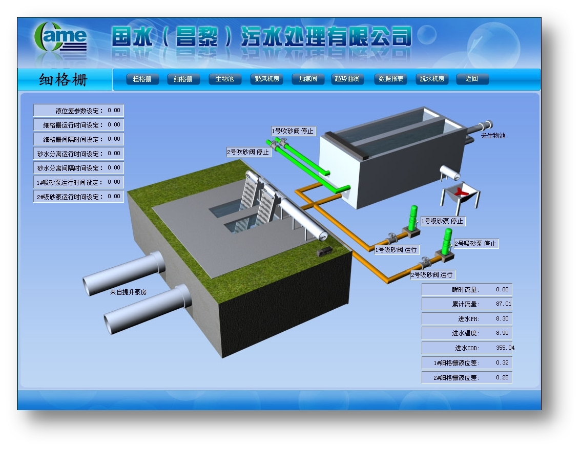 爬式粗格柵,進(jìn)水經(jīng)過粗格柵間過濾一些大的固體雜質(zhì),去除那些可能對水泵有影響的無機(jī)物。需要監(jiān)測格柵水位差、進(jìn)水流量、進(jìn)水酸堿度、進(jìn)水COD、提升泵狀態(tài)等參數(shù)。
