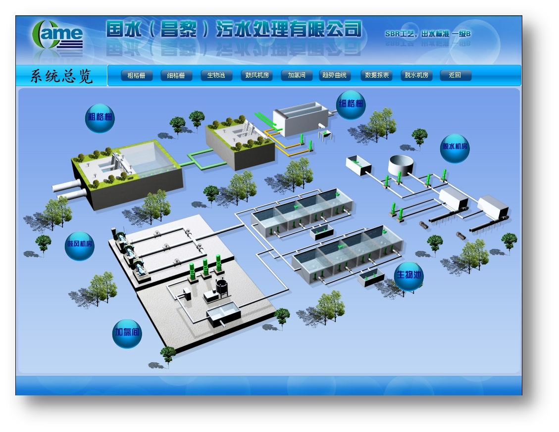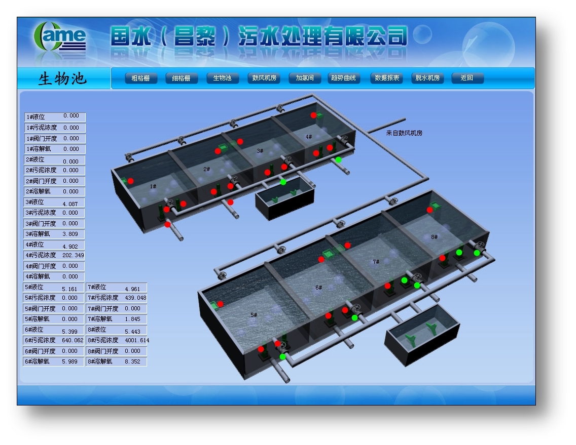 系統(tǒng)以美觀、友好的界面顯示設(shè)備運(yùn)行狀態(tài)、流量、水位、COD、超聲波液位計、溶解氧計、氧化還原電位計、污泥濃度計、電磁流量計等數(shù)據(jù),并以仿真圖、直方圖、曲線圖和棒圖等多種方式清晰直觀地顯示各個敏感數(shù)據(jù),方便用戶對各敏感數(shù)據(jù)進(jìn)行歷史查詢和對比分析。