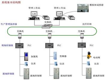 污水處理的工藝方法一般有氧化溝法﹑SBR法﹑鼓風曝氣法﹑AB法﹑A2O法等,由力控監控組態軟件組成的系統可有效地針對以上工藝制定相應的控制方案,該系統由生產管理監控級﹑現場控制級、就地控制級三層網絡結構組成,系統具備在線監測、數據采集顯示、遠程自動控制、網絡通訊、檢測數據分析管理、系統監測及故障報警等功能。典型的污水處理系統拓撲圖見下: