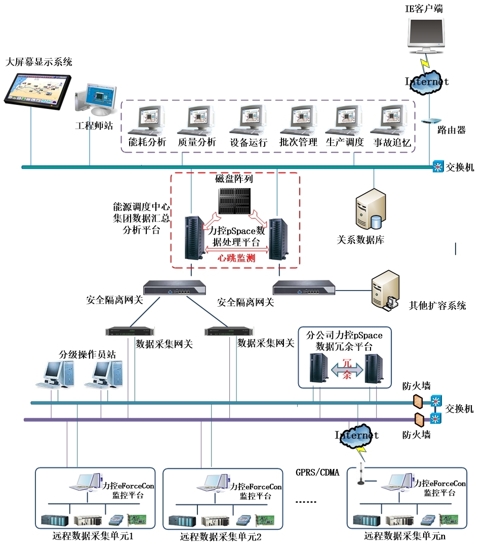 力控科技為企業(yè)EMS能源管理系統(tǒng)提供了綜合解決方案,典型能源系統(tǒng)架構(gòu)包括能源調(diào)度管理中心、通訊網(wǎng)絡(luò)、遠程數(shù)據(jù)采集單元等三級物理結(jié)構(gòu),其中信息采集與防護特點如下: