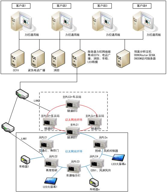 隧道的子系統主要包括:照明系統、通風系統、交通誘導系統、CCTV電視監控系統、火災報警系統、消防控制系統、緊急電話系統、廣播系統、LED顯示系統等。主要涉及的控制與檢測硬件有PLC控制器(監控通風、照明、消防水泵、車道/交通指示燈等)、車輛檢測器、亮度/照度檢測儀、風速/風向檢測儀、一氧化碳/能見度檢測儀、火災報警主機、LED顯示屏、緊急電話、CCTV系統。