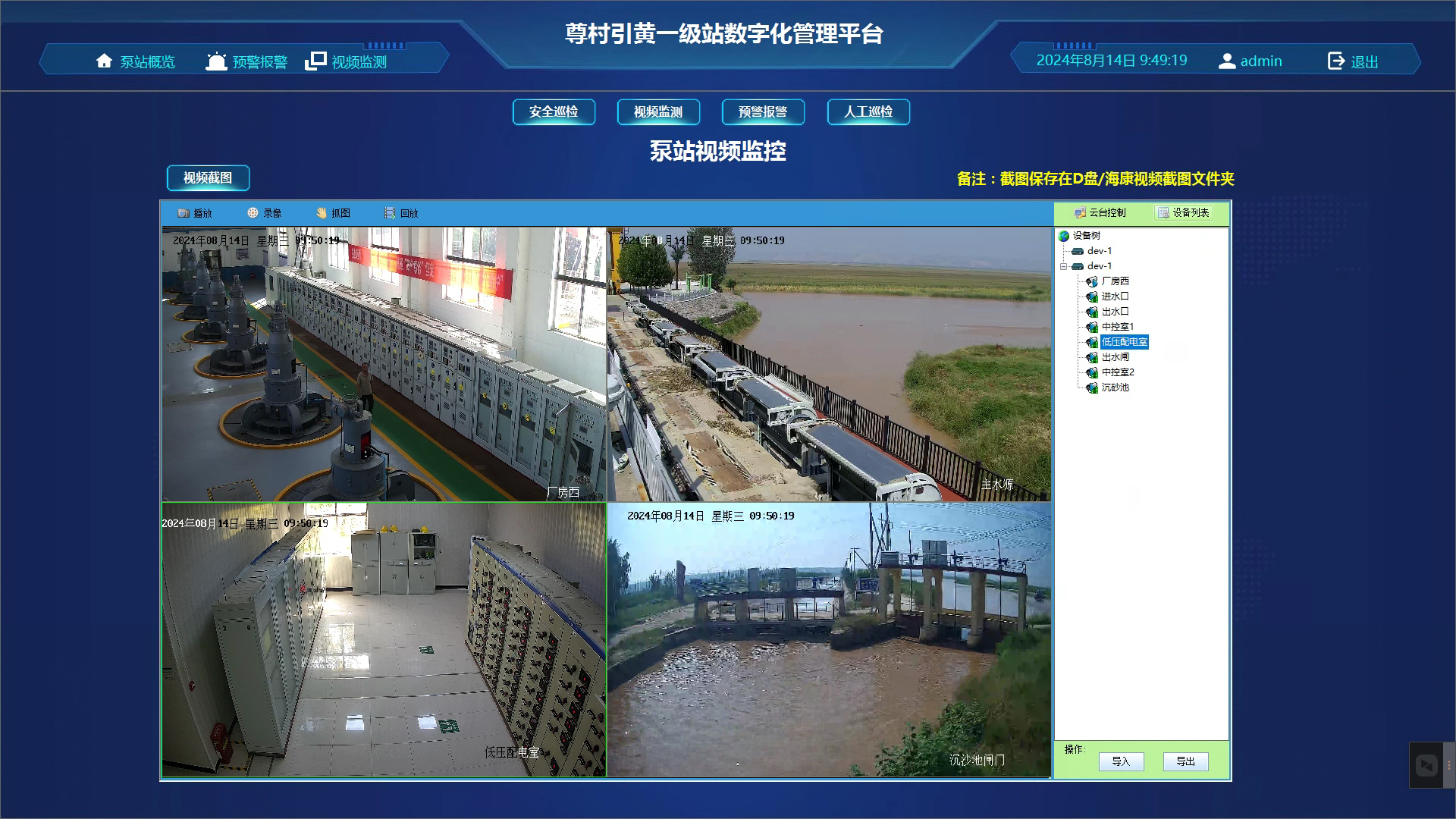 視頻巡檢:巡檢人員在中控室通過(guò)平臺(tái)操作區(qū)域攝像頭,檢查環(huán)境安全情況以達(dá)到巡檢目的,巡檢區(qū)域包括廠房、廠區(qū)、進(jìn)水閘、出水閘等重要地點(diǎn)。