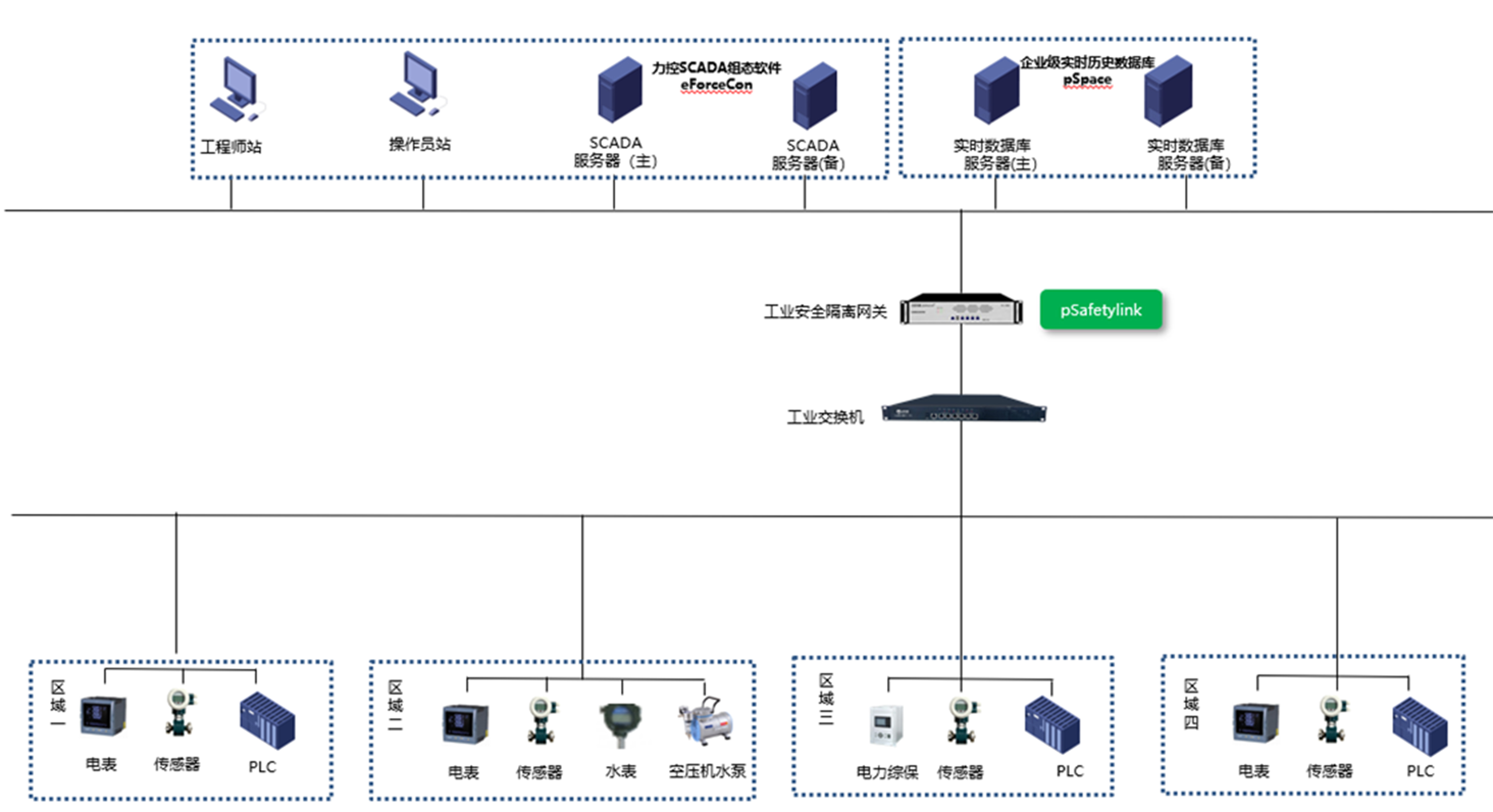 本項目基于力控SCADA平臺組態軟件eForceCon、企業級實時歷史數據庫pSpace產品設計,充分利用先進技術,對水廠設備以及儀表進行實時監控與管理。