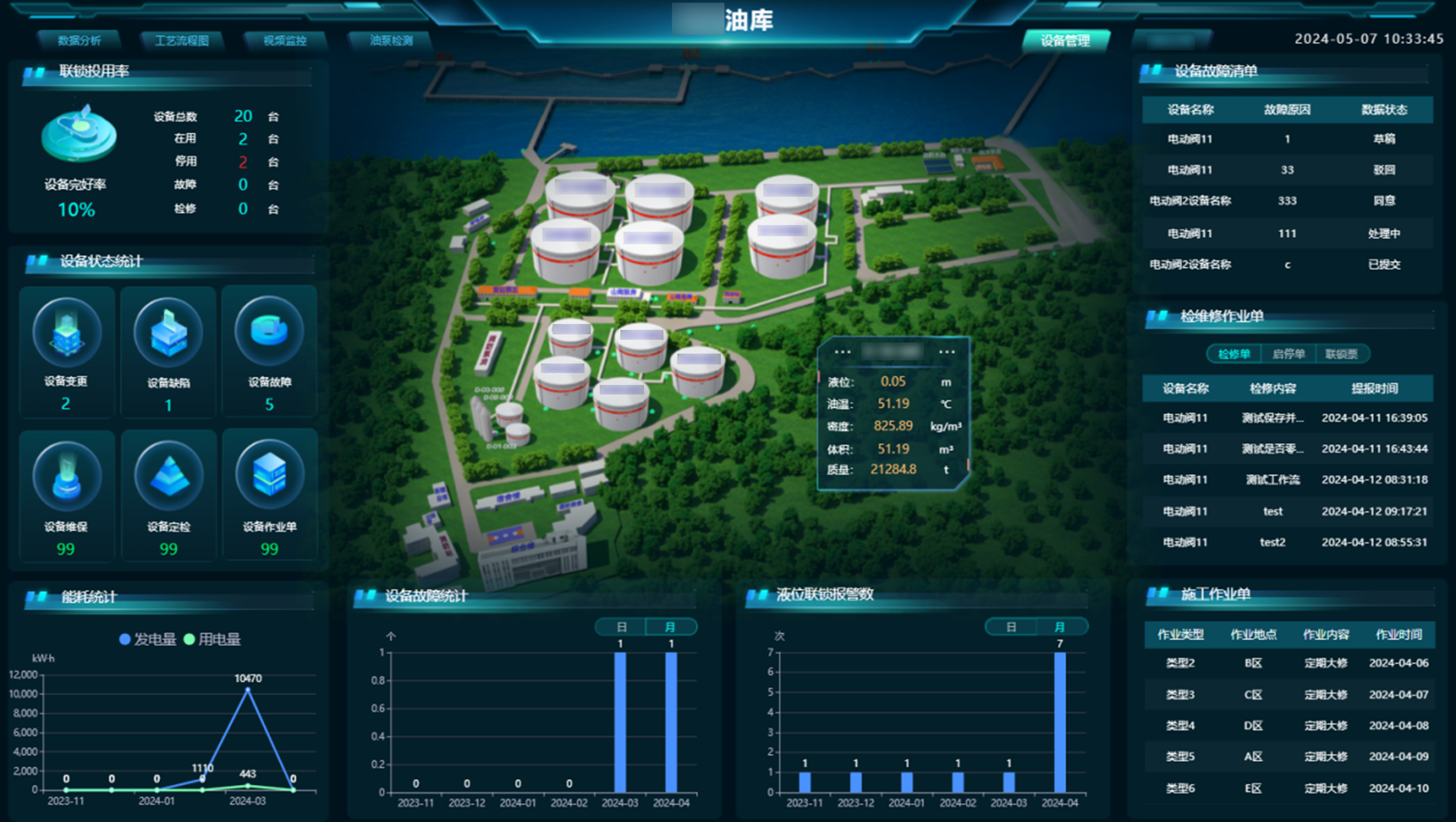 構建全局監控平臺,覆蓋作業流程、資源狀態、生產數據及安防報警等環節,支持生產報表自動生成、收發油計量統計、報警數據可視化分析等功能。通過省、庫級數字看板,直觀展示運營動態,提升預警響應效率。