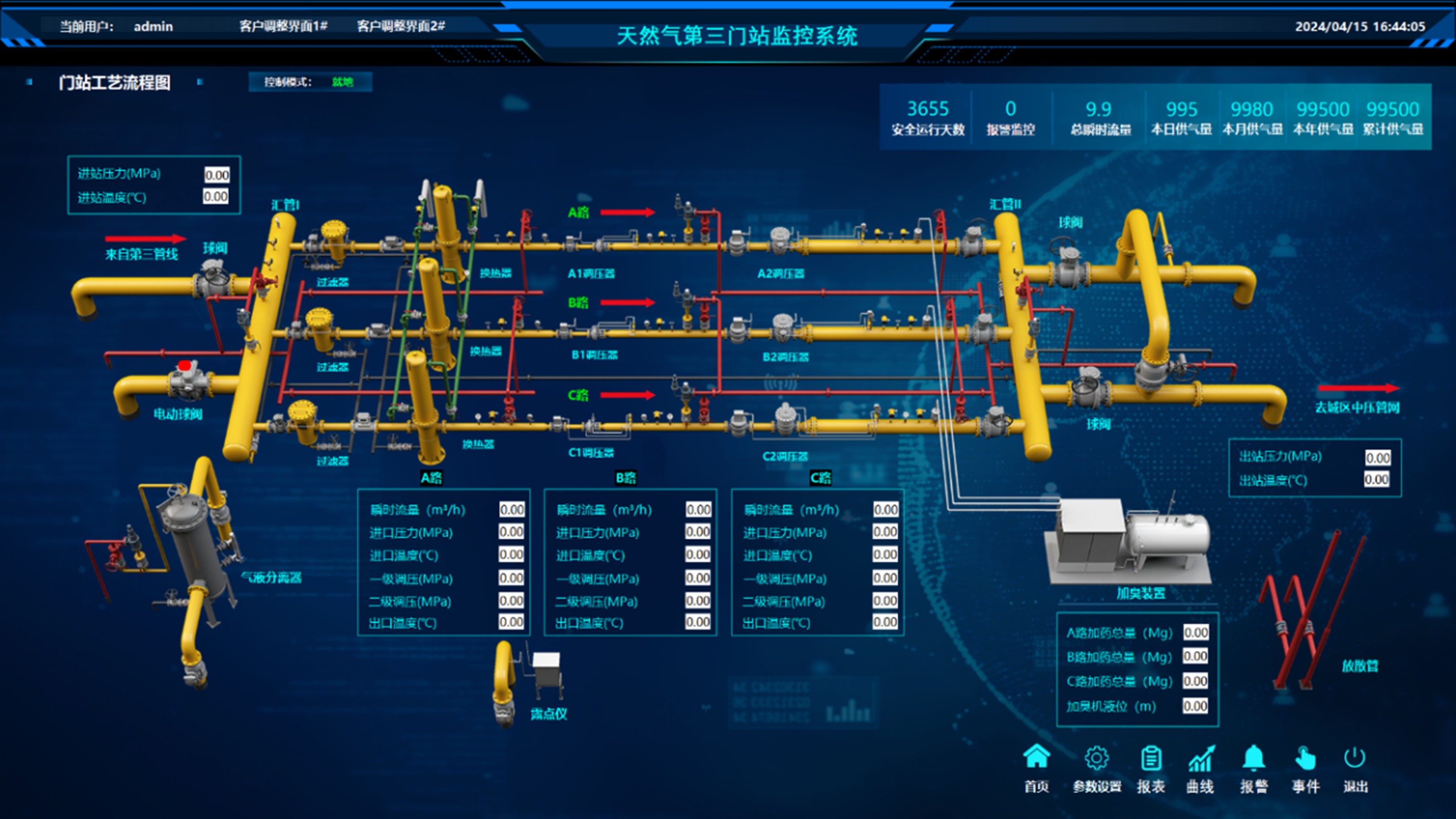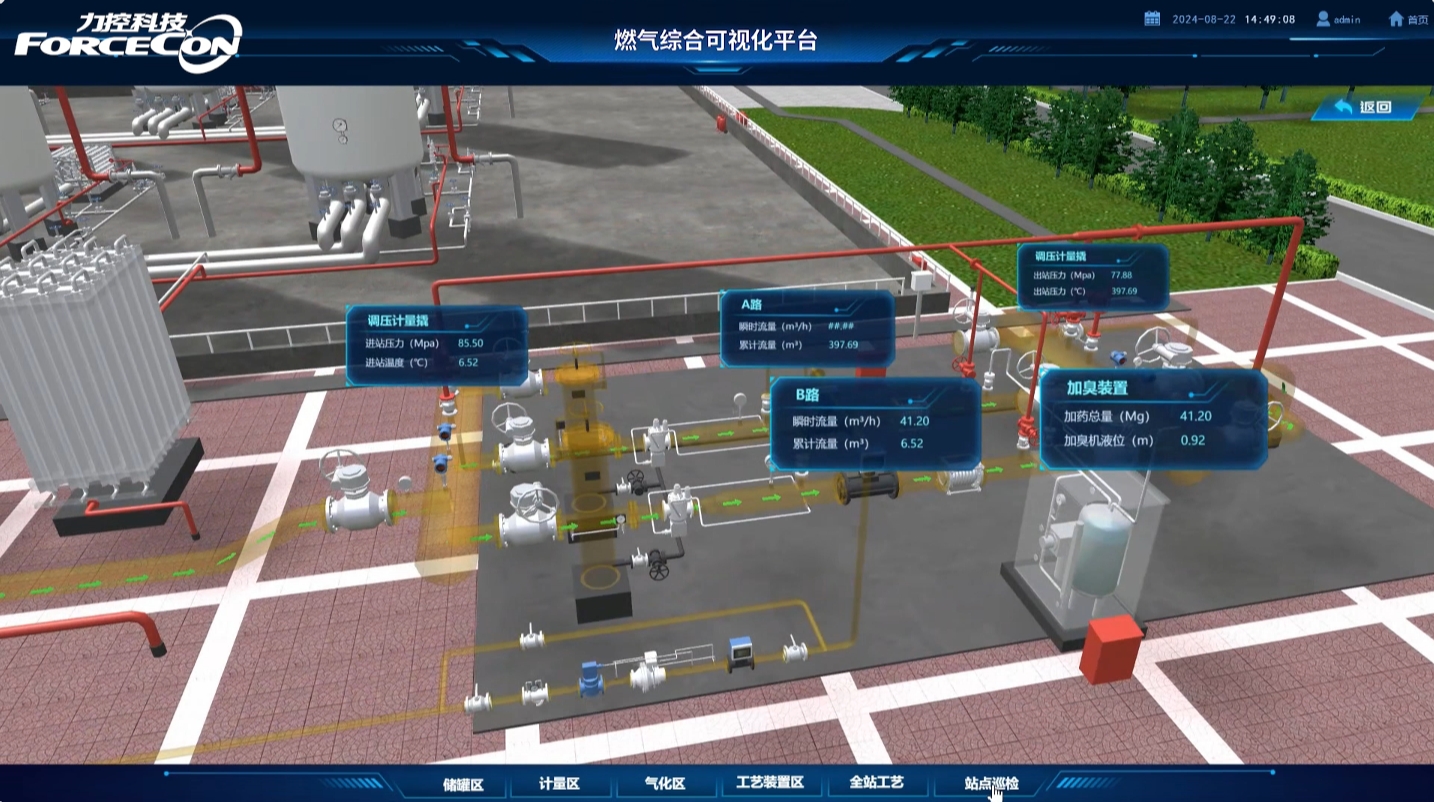 力控天然氣場站綜合管理系統(tǒng)的全流程工藝監(jiān)控,可直觀展示場站設(shè)備布局與實(shí)時(shí)運(yùn)行狀態(tài),支持動(dòng)態(tài)更新壓力、溫度、流量、瞬時(shí)值、累積值、計(jì)劃值等關(guān)鍵參數(shù),顏色變化與動(dòng)態(tài)移動(dòng)效果可直觀反映異常波動(dòng)。