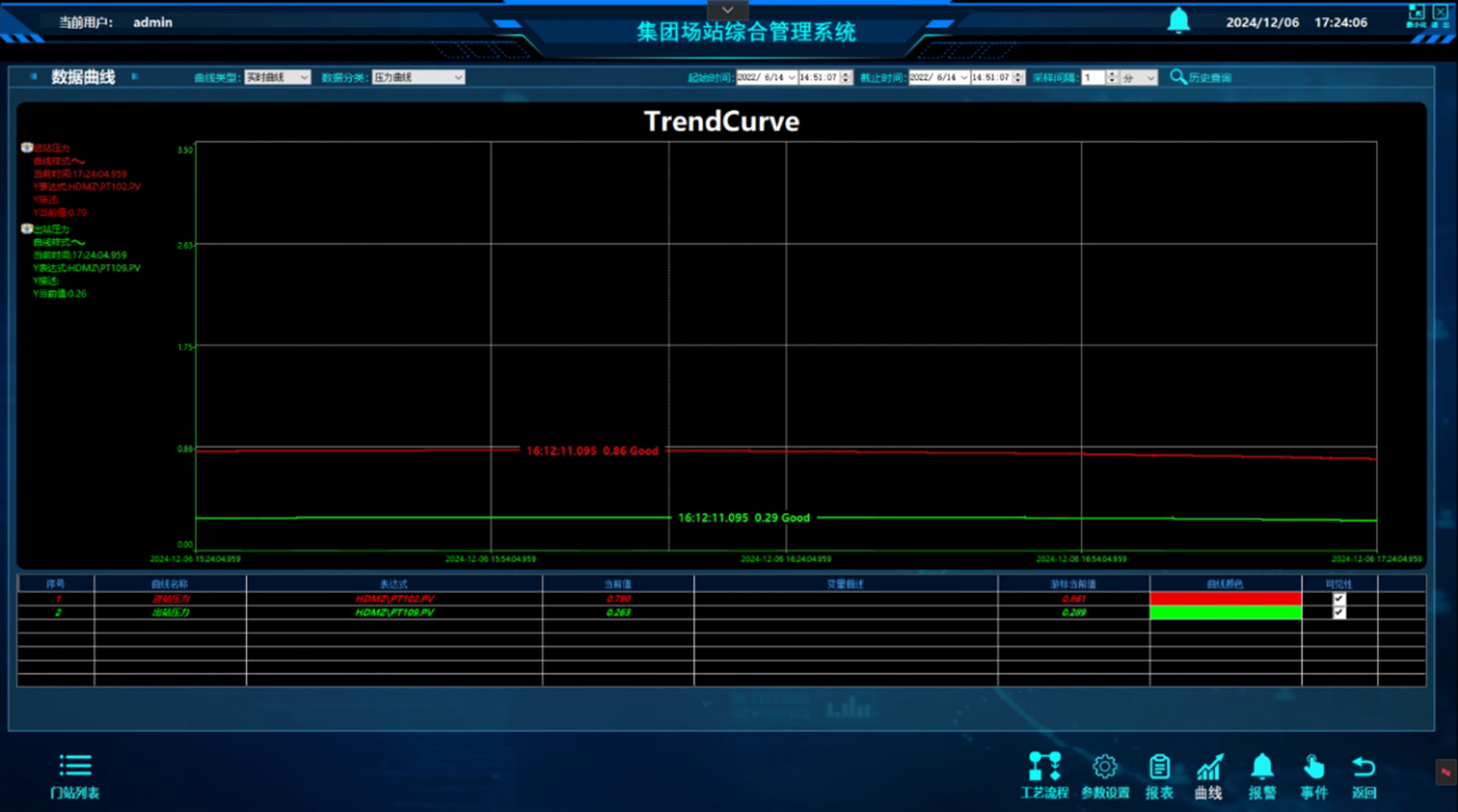 系統(tǒng)提供自定義時(shí)間段的趨勢曲線功能,可對(duì)比分析壓力、流量等參數(shù)的實(shí)時(shí)值與歷史數(shù)據(jù),快速定位故障發(fā)生時(shí)間及演變趨勢。
