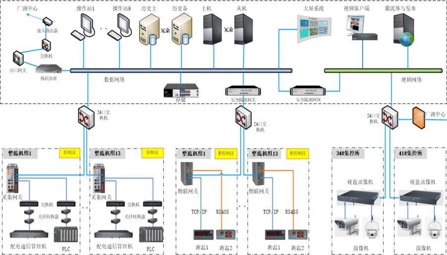 系統通過工業采集網關整合配電所繼保裝置、整流PLC系統及溫度監測數據,實現對直流電流/電壓、水溫/水壓、變壓器油溫/檔位等多源參數的統一采集與傳輸,并依托光纖網絡將數據實時匯總至廠調控中心。