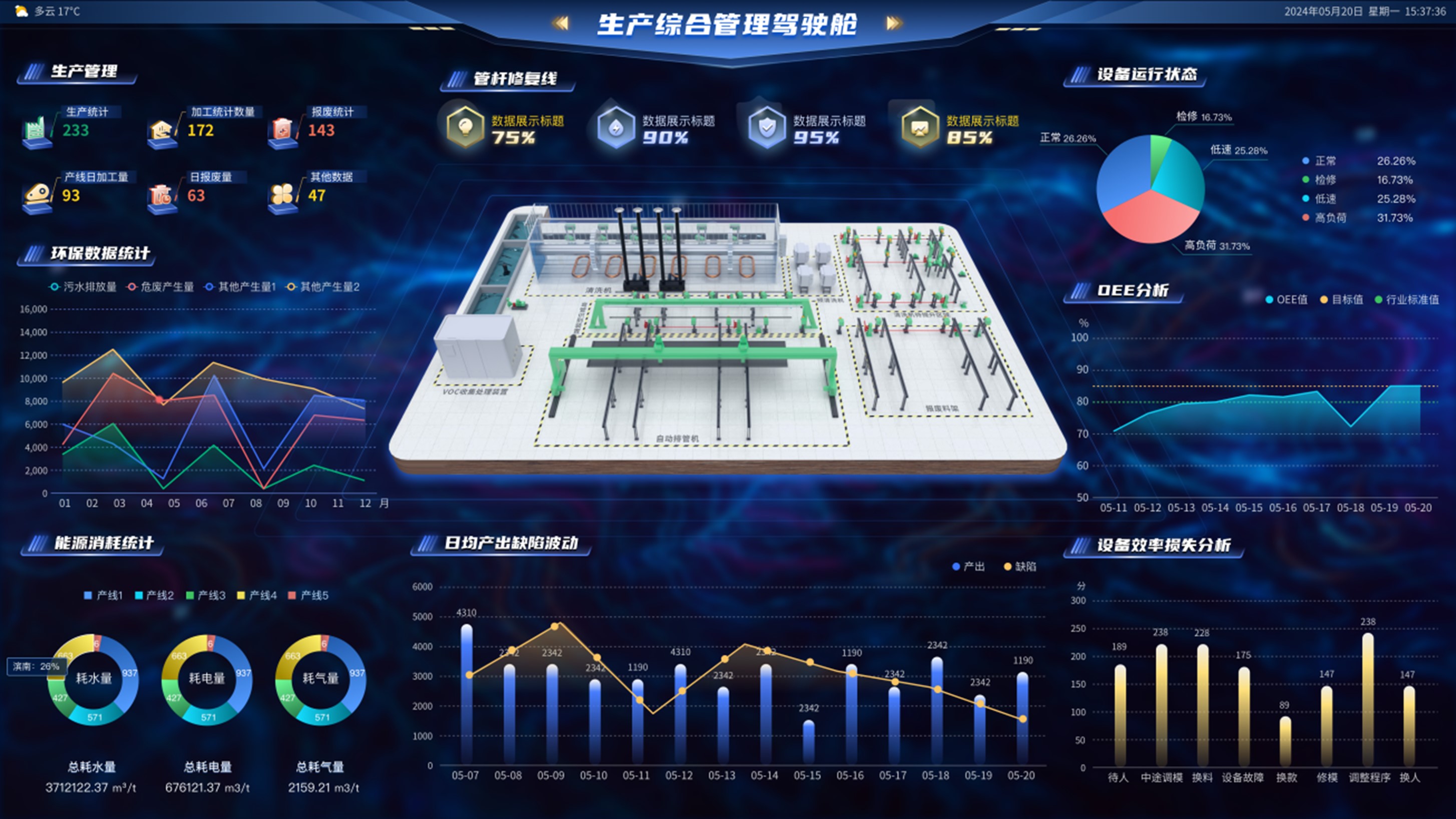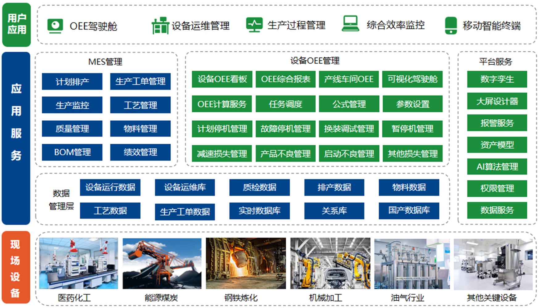 OEE計(jì)算服務(wù)能夠?qū)崿F(xiàn)可用性、性能和質(zhì)量指標(biāo)的綜合計(jì)算,形成覆蓋設(shè)備、生產(chǎn)線、車間等多層級的OEE綜合分析,運(yùn)用大屏可視化、報表和數(shù)字孿生等手段實(shí)現(xiàn)數(shù)據(jù)可視化展示。
