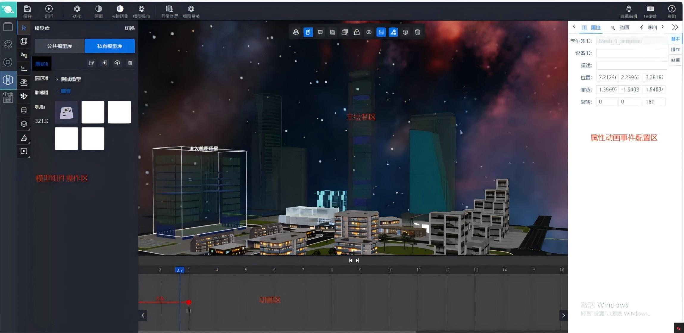 系統支持模型導入(如 gltf、glb、obj 等通用格式)與原生 3D 圖元繪制兩種建模方式,靈活適配不同項目需求。通過光源、相機、地面、天空盒等環境要素配置,結合動畫邏輯與腳本控制,高度還原真實工業環境。支持多場景自由切換,助力用戶高效構建覆蓋全廠、車間、產線的智慧化三維場景。