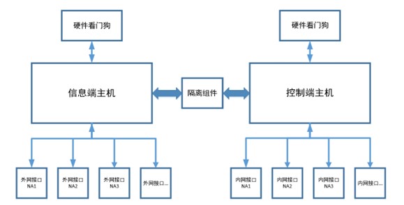“2+1”隔離技術架構由兩個獨立主機系統組成,一端的主機系統為控制端,用于連接控制網絡。另一端的主機系統為信息端,用于連接信息網絡。兩端主機均采用高性能嵌入式硬件,主板上各有多個以太網接口用來連接要隔離的兩個網絡,兩端主機通過隔離裝置進行連接,保證數據交互的安全性。