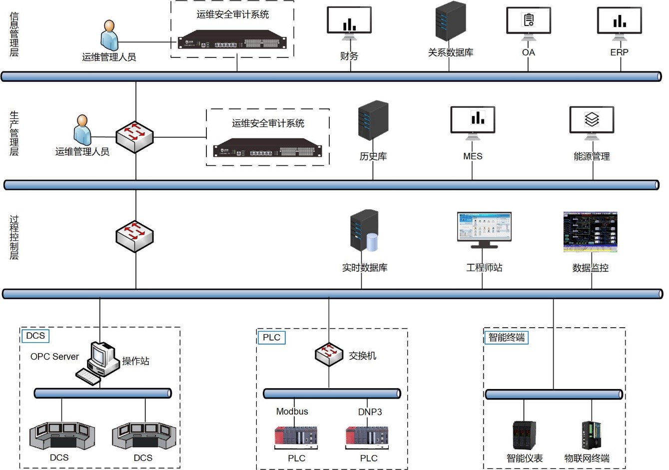 在信息管理層和生產(chǎn)管理層部署堡壘機(jī),對服務(wù)器、網(wǎng)絡(luò)設(shè)備、安全設(shè)備進(jìn)行日常操作與運(yùn)維的安全防護(hù),使用數(shù)字證書作為數(shù)據(jù)庫系統(tǒng)身份認(rèn)證方式。強(qiáng)制規(guī)定密碼復(fù)雜度規(guī)則、密碼有效時(shí)限、密碼長度、密碼嘗試次數(shù)、密碼鎖定等。僅設(shè)置一位管理員具備系統(tǒng)權(quán)限,其余數(shù)據(jù)庫賬號(hào)僅授予能夠滿足使用需求的最小權(quán)限。堡壘機(jī)扮演著看門者的職責(zé),所有對網(wǎng)絡(luò)設(shè)備和服務(wù)器的請求都要從這扇大門經(jīng)過。因此安全管理與審計(jì)系統(tǒng)能夠攔截非法訪問和惡意攻擊,對不合法命令進(jìn)行阻斷、過濾掉所有對目標(biāo)設(shè)備的非法訪問行為并記錄詳細(xì)信息。堡壘機(jī)具備輸入輸出審計(jì)功能,不僅能夠詳細(xì)記錄用戶操作的每一條指令,而且能夠?qū)⑺械妮敵鲂畔⑷坑涗浵聛恚痪邆鋵徲?jì)回放功能,能夠模擬用戶的在線操作過程,豐富和完善了網(wǎng)絡(luò)的審計(jì)功能。安全管理與審計(jì)系統(tǒng)能夠在自身記錄審計(jì)信息的同時(shí)在外部某臺(tái)計(jì)算機(jī)上做存儲(chǔ)備份,可以極大增強(qiáng)審計(jì)信息的安全性,保證審計(jì)人員有據(jù)可查。系統(tǒng)管理員可以通過多種查詢條件查看審計(jì)信息。堡壘機(jī)保護(hù)單位內(nèi)部網(wǎng)絡(luò)設(shè)備及服務(wù)器資源的安全性,使得單位內(nèi)部網(wǎng)絡(luò)管理合理化和專業(yè)化。