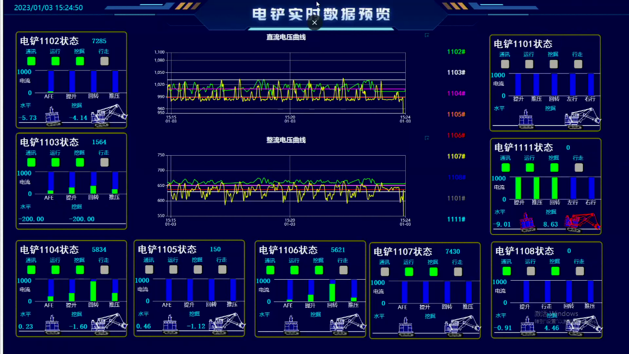 實現(xiàn)對各電鏟工藝流程圖實時監(jiān)測畫面,畫面支持?jǐn)?shù)字、動畫、圖表、曲線等顯示方式