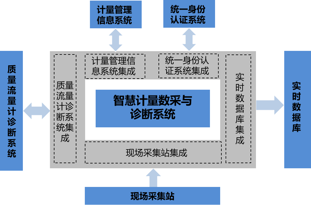 系統具備標準化輸出接口或數據共享接口,為上位管理系統提供數據集成服務,可以把計量儀表實時狀態信息、儀表在線率、采集完好率、報警率、處理結果信息推送到上層應用系統;把系統產生的重要報警推送給上位管理系統,同時通過計量管理信息系統、MES系統等獲取基礎信息,用戶維護一套臺賬,通過接口實現信息共享調用。系統集成包括:現場采集站、質量流量計診斷系統、實時數據庫、計量管理信息系統、統一身份認證系統。