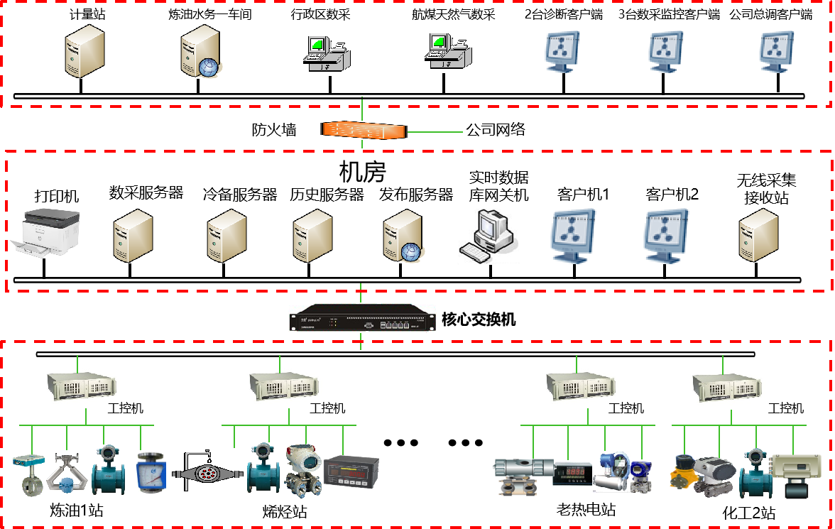 通過設置在控制室內的集中監控系統給用戶提供美觀實用的大屏分析展示功能,便于用戶管理者,實時掌握整體系統、儀表、管網實時運行狀態匯總信息。基本架構,顯示在線率、完好率、報警率,重要介質管網檢測率、主輔比對差率、實時報警信息,獲取調度系統生產調整信息或當班人員手工錄入生產運行動態及調整信息等內容。
