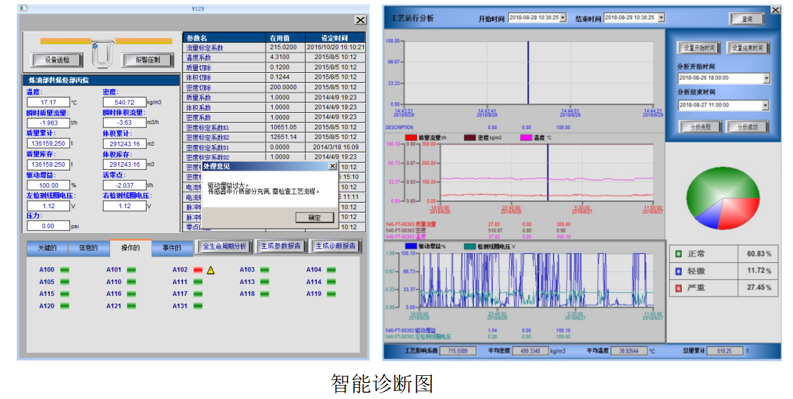 集成質量流量計智能診斷,實現集中統一監測管理。通過系統判斷是否為測量管異常、驅動增益不穩定等原因引起的故障,同時給出相應的處置意見。對超聲流量計聲速、增益值、信號質量、信噪比和流速特性等關鍵信息實時監測診斷。電磁、渦街、差壓等根據不同原理設置不同監測模型,實現監測診斷。