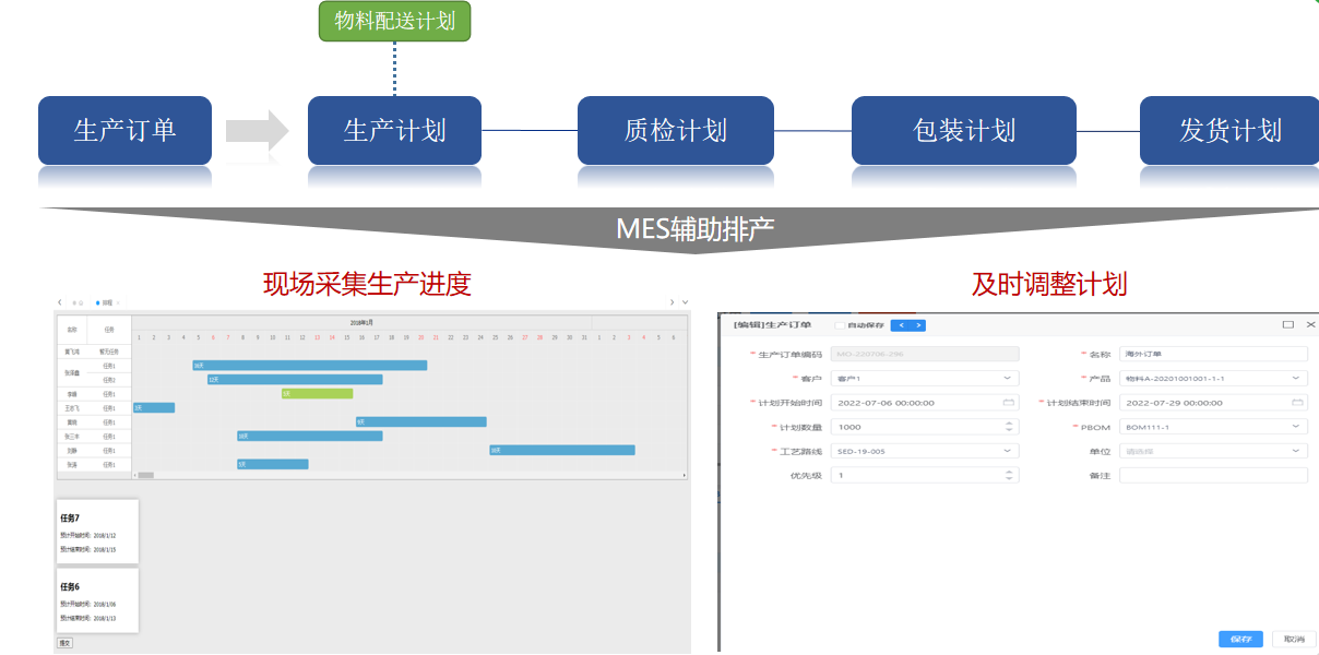 MES 系統接收頂層 ERP下發的生產計劃,通過排產算法結合管理者的意愿、其他信息系統的數據、和當前物料信息、設備狀態等關鍵信息,分解成生產計劃并生成對應工位的詳細工單,指導生產。