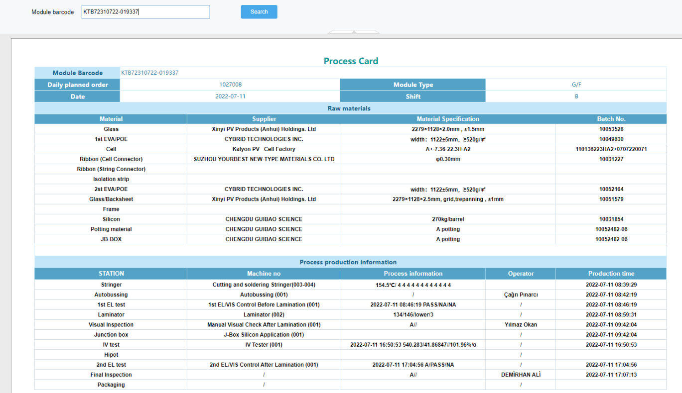 由原料采購入庫開始,對每批次原材料的采購信息進行詳細記錄,生成原料入庫質檢結果和批次信息的一一對應,在后期生產領料、粘膠、切片、清洗、串焊、敷設、測試、層壓、組框、固化、分檔和包裝入庫、出庫的整個環節采用條碼批次掃描,達到生命周期的全過程可追溯性。