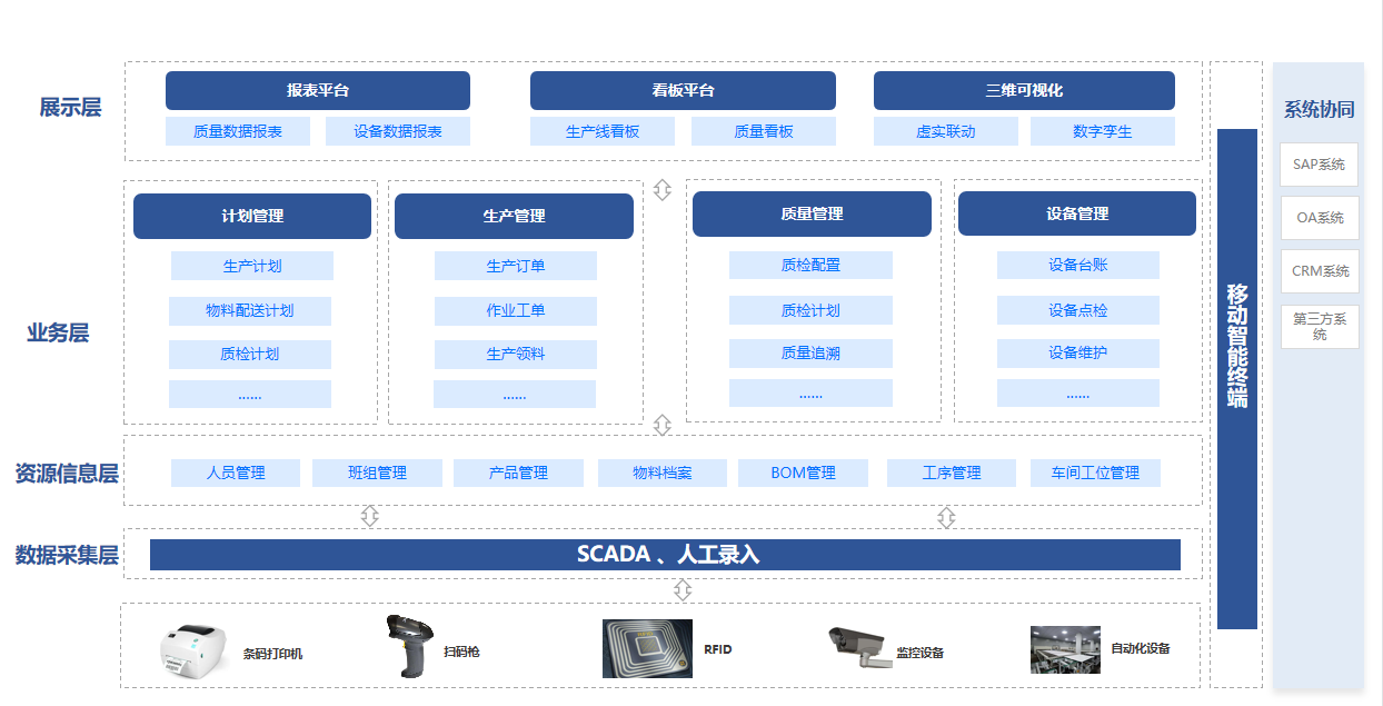 通過對工廠數(shù)據(jù)進行集中的收集、分析和統(tǒng)計,為企業(yè)提供各種可視化管理報表和看板,運用工業(yè)平板、手機、PDA等移動端遠程操作和查看,真正實現(xiàn)線上的智能化工廠管理。