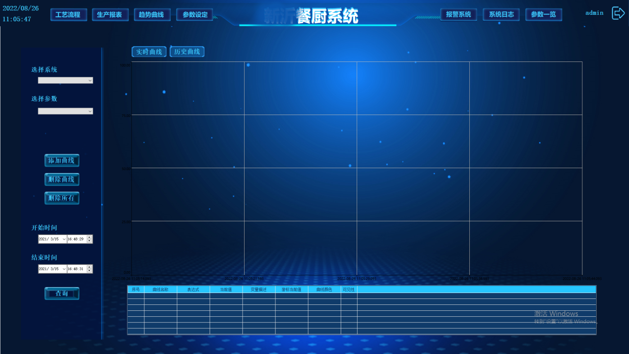 操作員可通過菜單或按鈕進(jìn)入實(shí)時(shí)曲線畫面或歷史曲線畫面,可選擇需要的工藝參數(shù)查看實(shí)時(shí)曲線或歷史曲線,可同時(shí)顯示多條實(shí)時(shí)曲線,可對(duì)曲線進(jìn)行放大或縮小,可任意選擇需要查看的時(shí)間段。