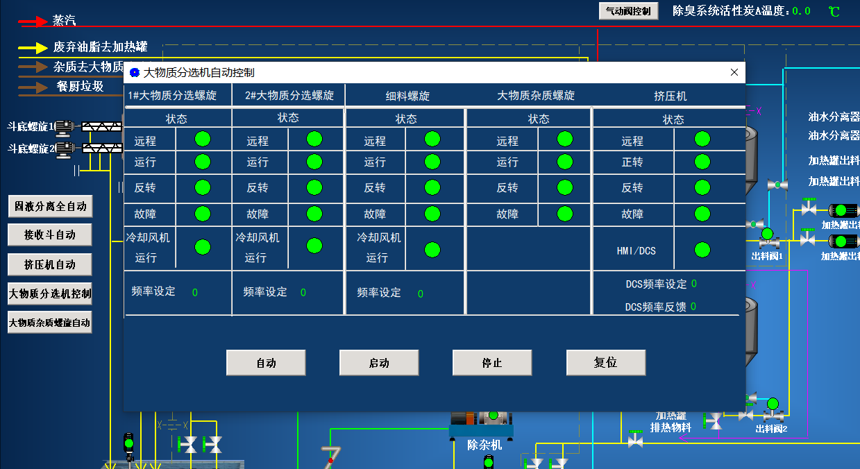 實(shí)時(shí)動(dòng)態(tài)地顯示全廠工藝流程圖,實(shí)時(shí)動(dòng)態(tài)畫面采用縱斷流程和平面流程相結(jié)合的流程圖顯示方式;流程圖中所有設(shè)備的運(yùn)行狀態(tài)采用不同顏色明確顯示其運(yùn)行狀態(tài)。
