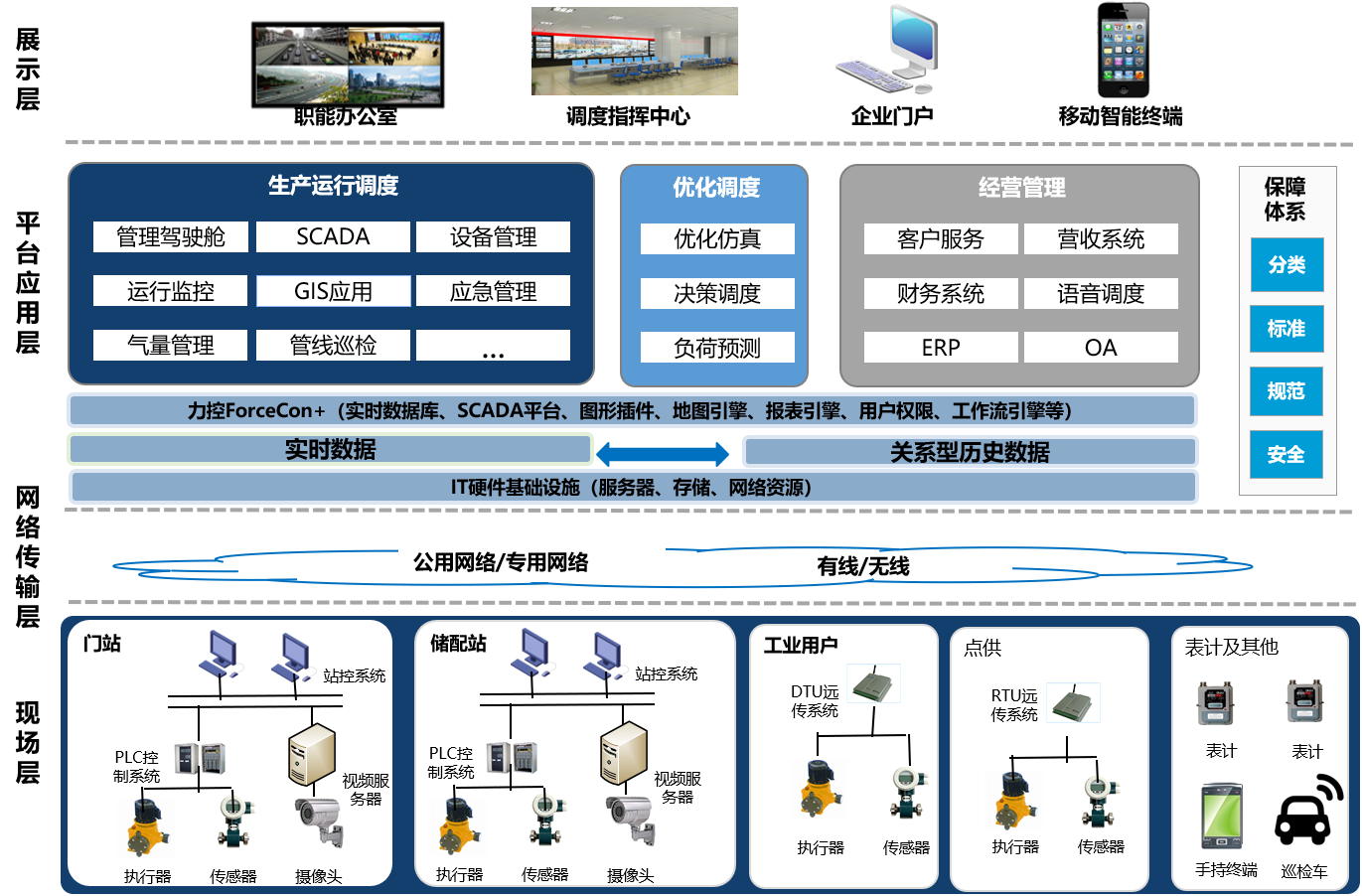 力控智慧燃氣生產運行調度系統主要以SCADA系統的實時工況數據及實時視頻信息平臺為支撐,實現在系統應用平臺中的立體關聯展示、綜合查詢分析和測控一體操作,以GIS系統的空間地圖數據為平臺支撐基礎,疊加管網及附屬設施信息、人員信息,以GPS系統的巡線功能為平臺,實現在后臺的遠程監控與調度。實現了不同系統之間的數據的互聯互通,提升平臺的綜合分析及管理能力。同時充分融入人工智能、互聯網、5G、物聯網和大數據等新技術,實現燃氣管網遠程監測控制、科學調度、安全保障,為生產運行及管網維護部門、客服部門、工程技術管理部門等提供方便快捷的業務支持與管理,提供智慧決策分析等深層應用。