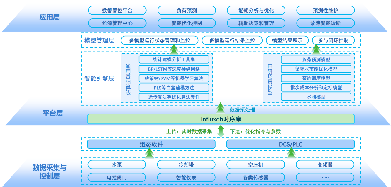 力控泵站AI節(jié)能優(yōu)化調(diào)控系統(tǒng)方案結(jié)合水泵理論知識(shí)、工業(yè)AI技術(shù)和互聯(lián)網(wǎng)技術(shù),基于實(shí)際工況運(yùn)行數(shù)據(jù)以及分級調(diào)度規(guī)劃,建立泵組效能模型和泵站調(diào)度模型,實(shí)現(xiàn)水泵群精準(zhǔn)優(yōu)化調(diào)控和最優(yōu)能效,從而實(shí)現(xiàn)泵房高效及安全運(yùn)行,助力企業(yè)實(shí)現(xiàn)節(jié)能降耗、向資源節(jié)約型經(jīng)濟(jì)轉(zhuǎn)型升級: